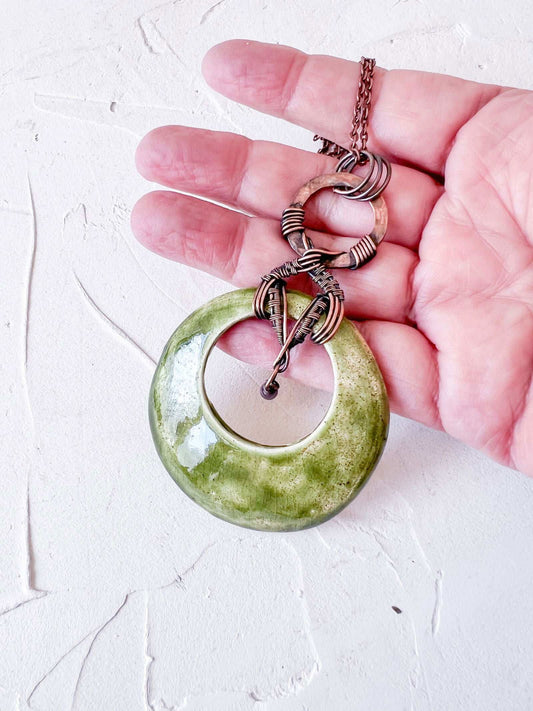 Handmade Green Glaze Ceramic and Copper Boho Pendant Necklace