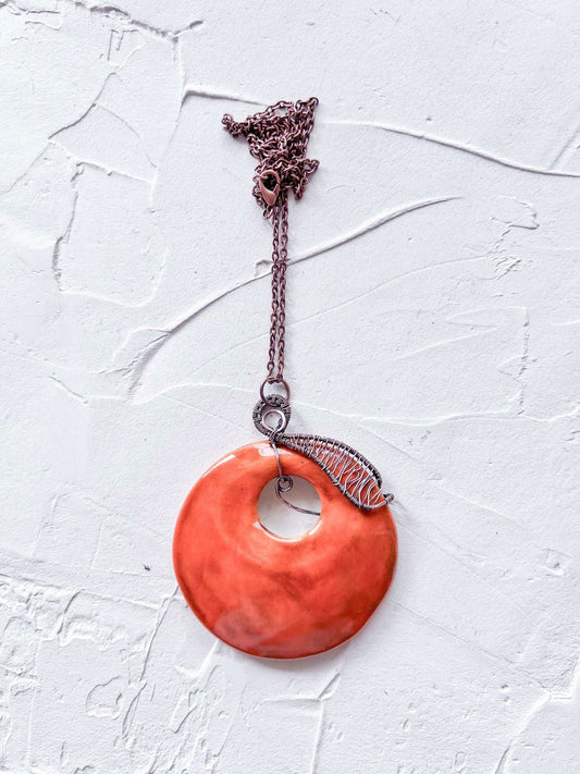 Handmade Orange Glaze Ceramic and Copper Boho Pendant Necklace