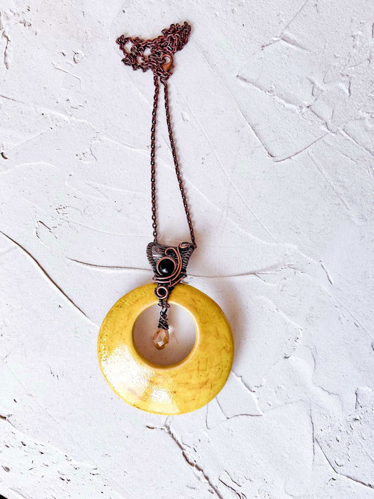 Handmade Yellow Glaze Ceramic and Copper Boho Pendant Necklace