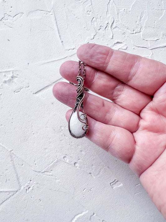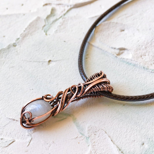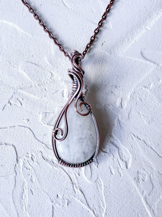 Elegant Rainbow Moonstone and Copper Wire Pendant