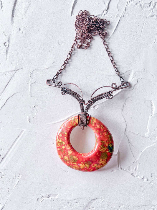 Handmade Orange Glaze Ceramic and Copper Boho Pendant Necklace