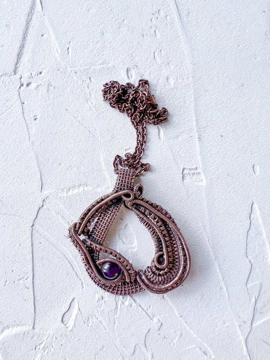 Copper Wire Woven Egyptian Style Pendant Necklace with Amethyst Bead