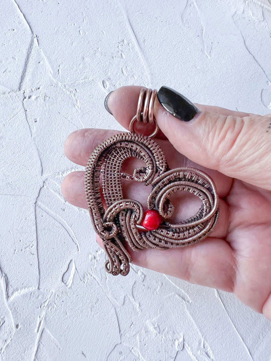 Copper Wire Woven Heart Pendant Necklace with Red Jade Bead