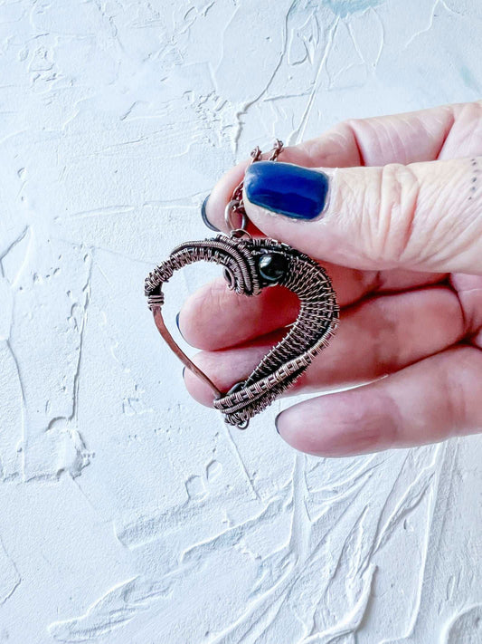 Copper Wire Woven Heart with Black Tourmaline Pendant Necklace Hand Made