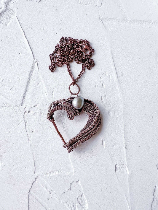 Copper Wire Woven Heart with Pearl Pendant Necklace Hand Made