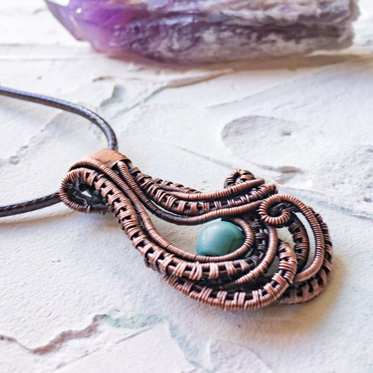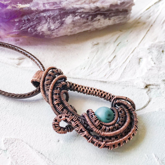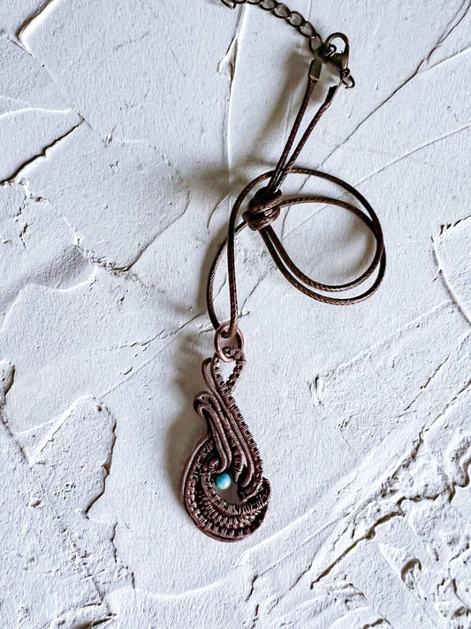 Copper Wire Woven Pendant Necklace Hand Made with a turquoise bead