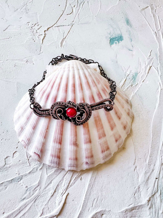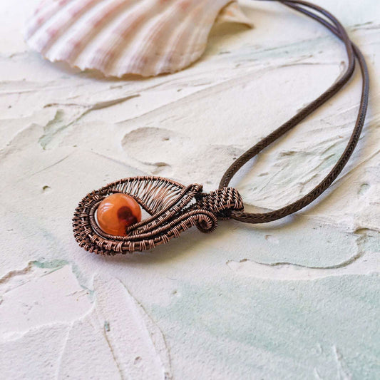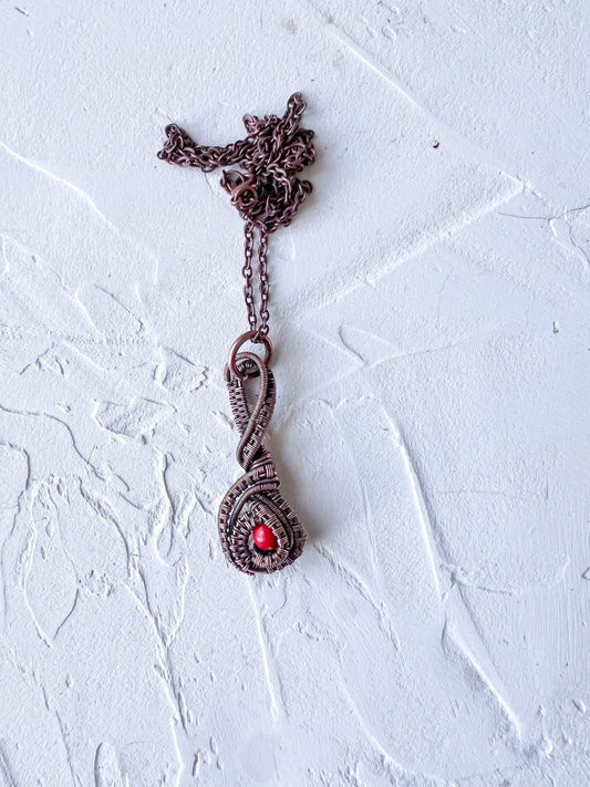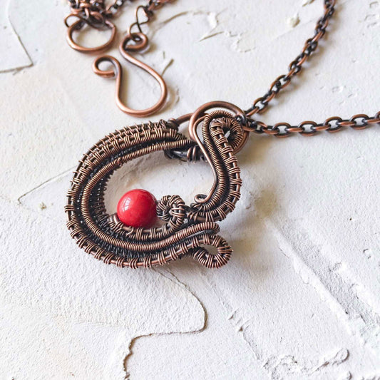 Copper Wire Woven Pendant Necklace with Red Jade Bead