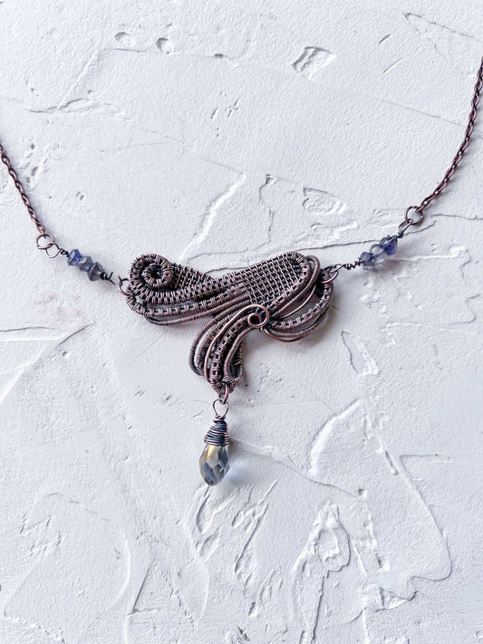 Exquisite Wire Woven Pendant Necklace with Iolite Accents