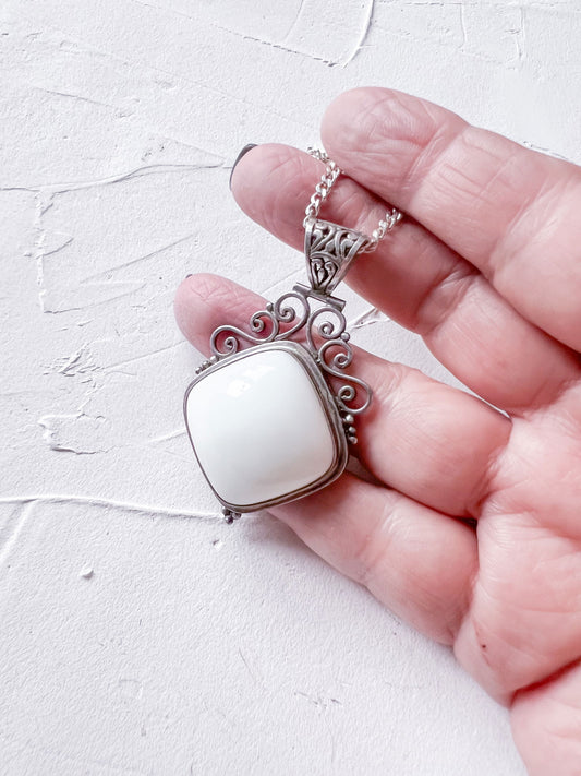 Vintage Silver and Milk Glass Pendant Necklace