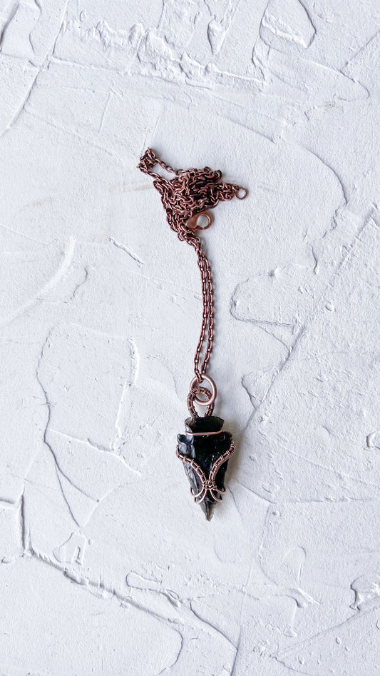 Black Obsidian Arrowhead Pendant Necklace with Copper Weave – Guanyin Collection