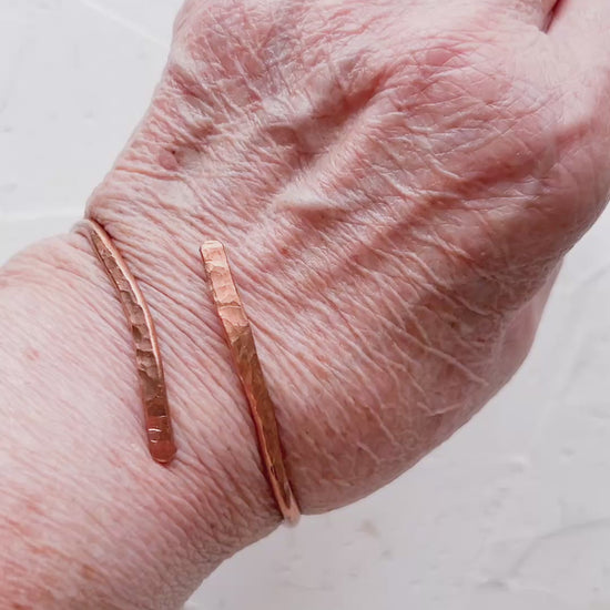 This handcrafted open bangle is formed from solid copper wire, gently hammered at each end to create a subtle, organic texture that catches the light without making a fuss. The rounded band remains smooth and comfortable, while the flattened tips add just enough character to keep things interesting.